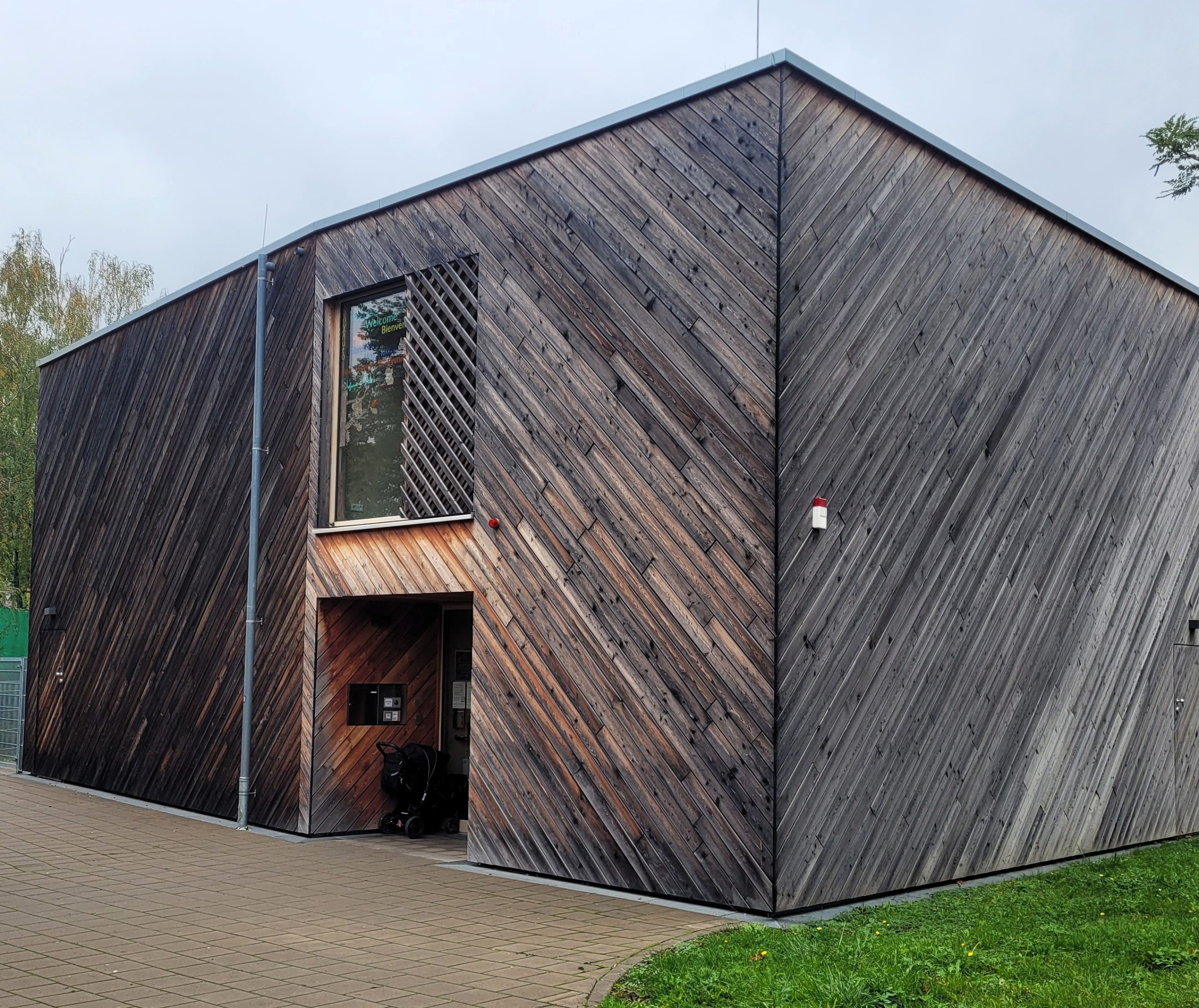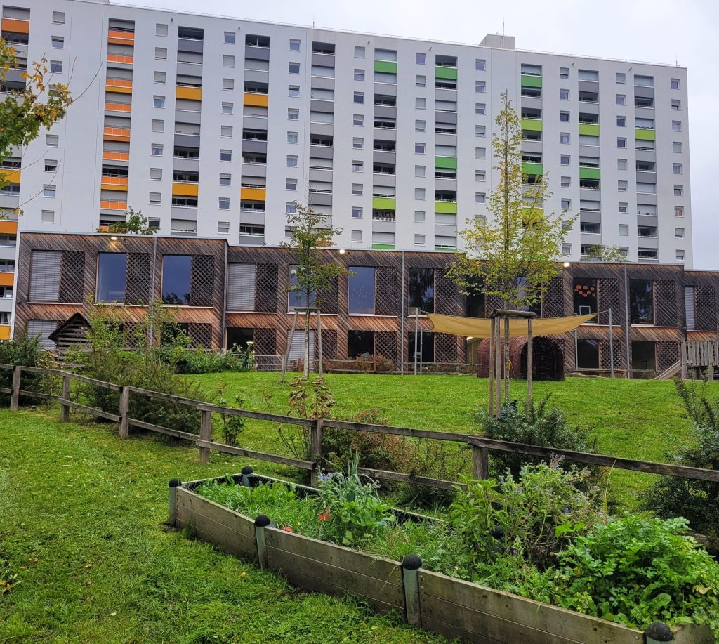 Das zweigeschossige Kinderhaus wurde als Holzmodulbau auf einer massiven Bodenplatte errichtet. Holz prägt Konstruktion, Gestaltung und Atmosphäre der Innen- und Außenräume.
