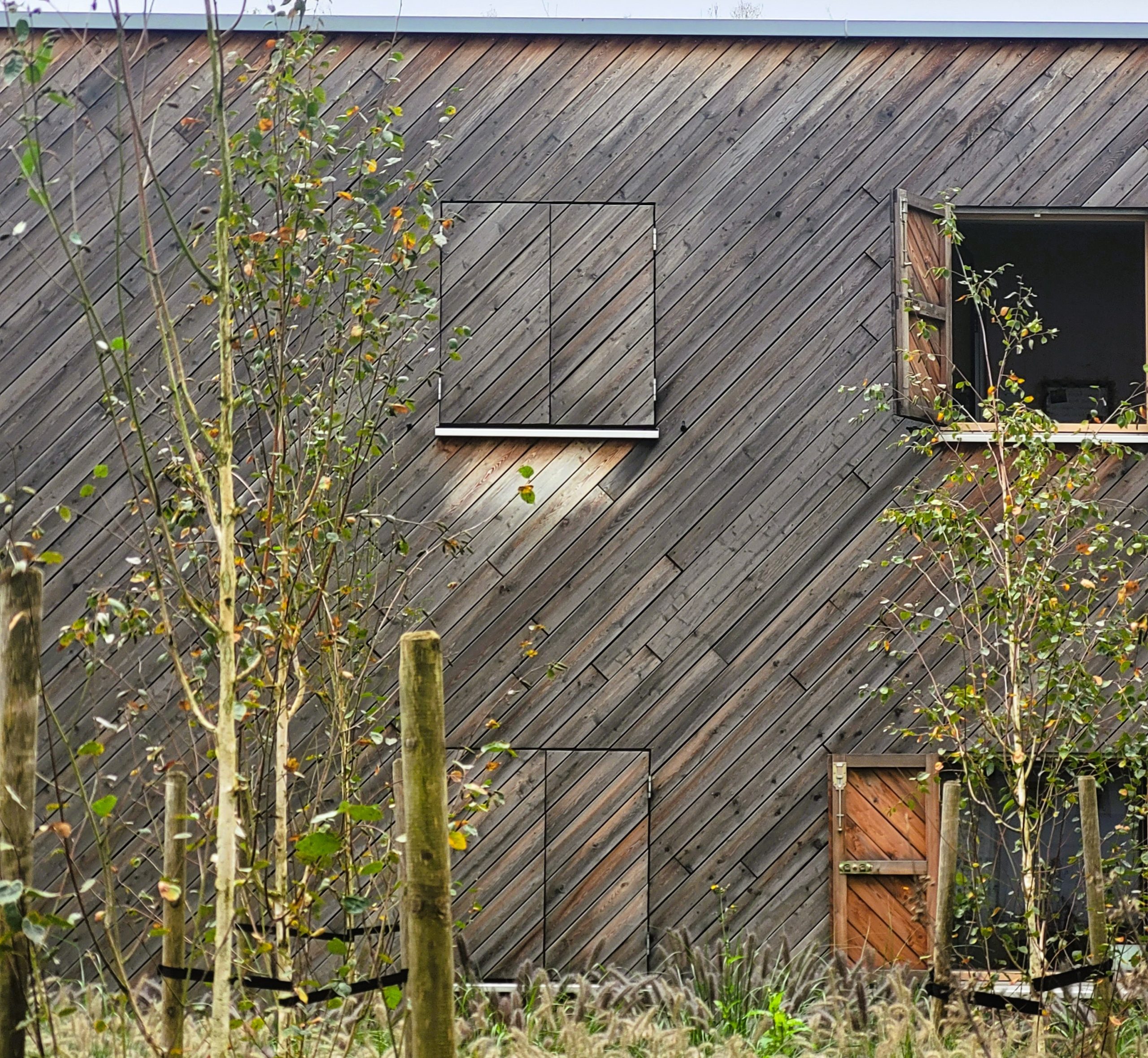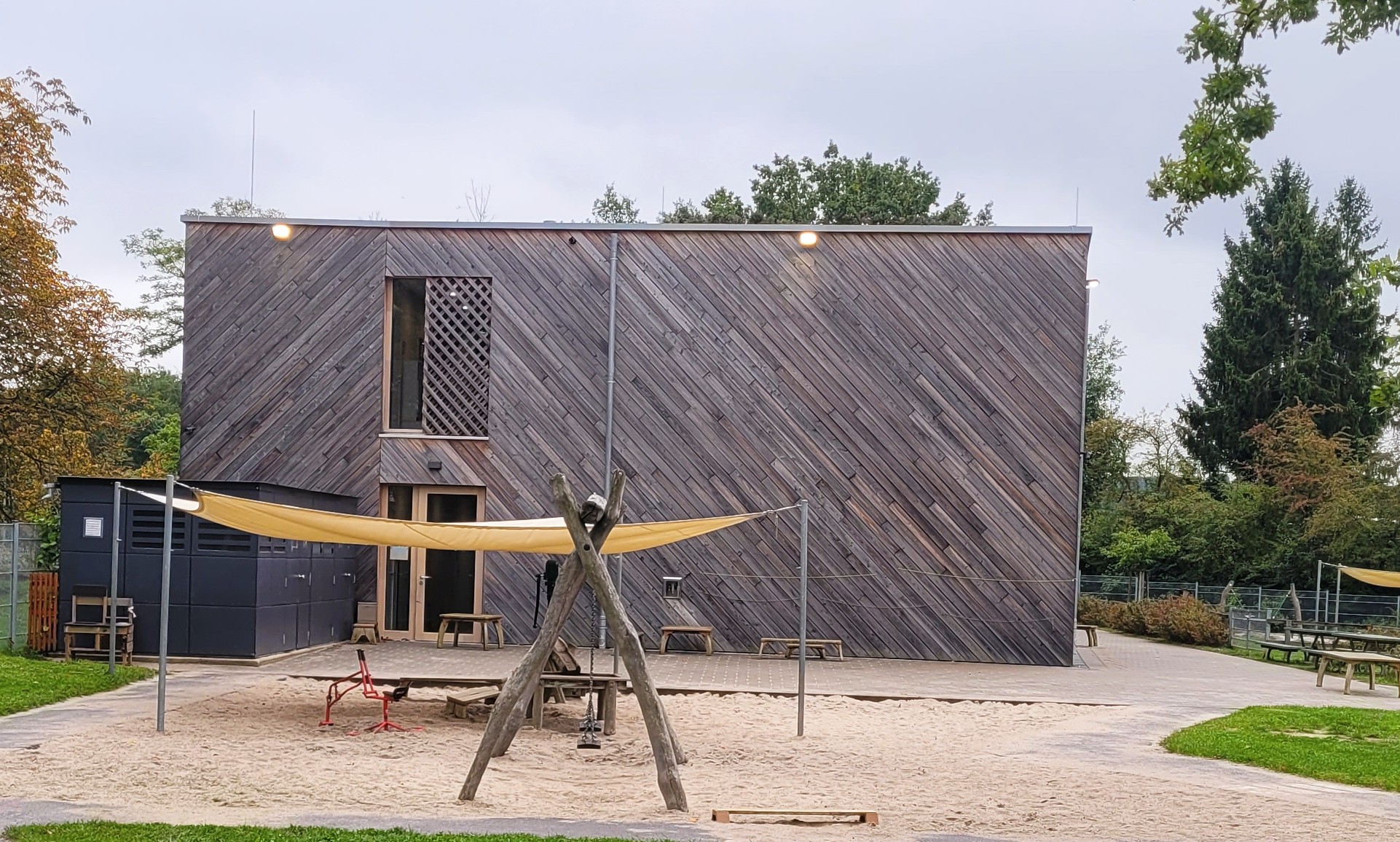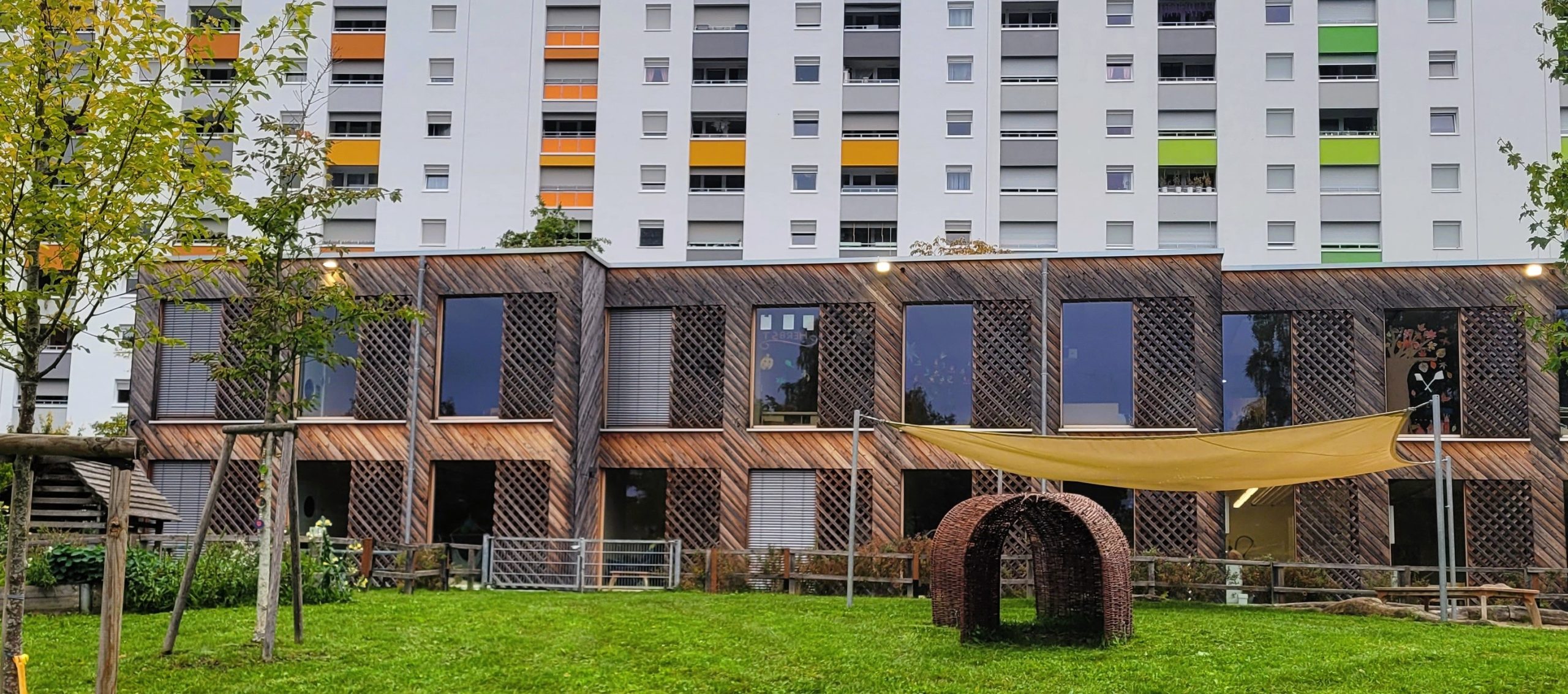 Zur geschlossenen Siedlungsseite liegen Mitarbeiter- und Elterngesprächsräume, Lagerräume und ein Kinderwagenabstellraum. Zur Parkseite orientieren sich die lichtdurchfluteten Gruppenräume, ergänzt durch Bewegungsraum und Speisesaal im Erdgeschoss sowie vier Gruppenräume im Obergeschoss. Ein Raster aus Lärchenholzlatten dient als Absturzsicherung, Sichtschutz und gestalterisches Element.